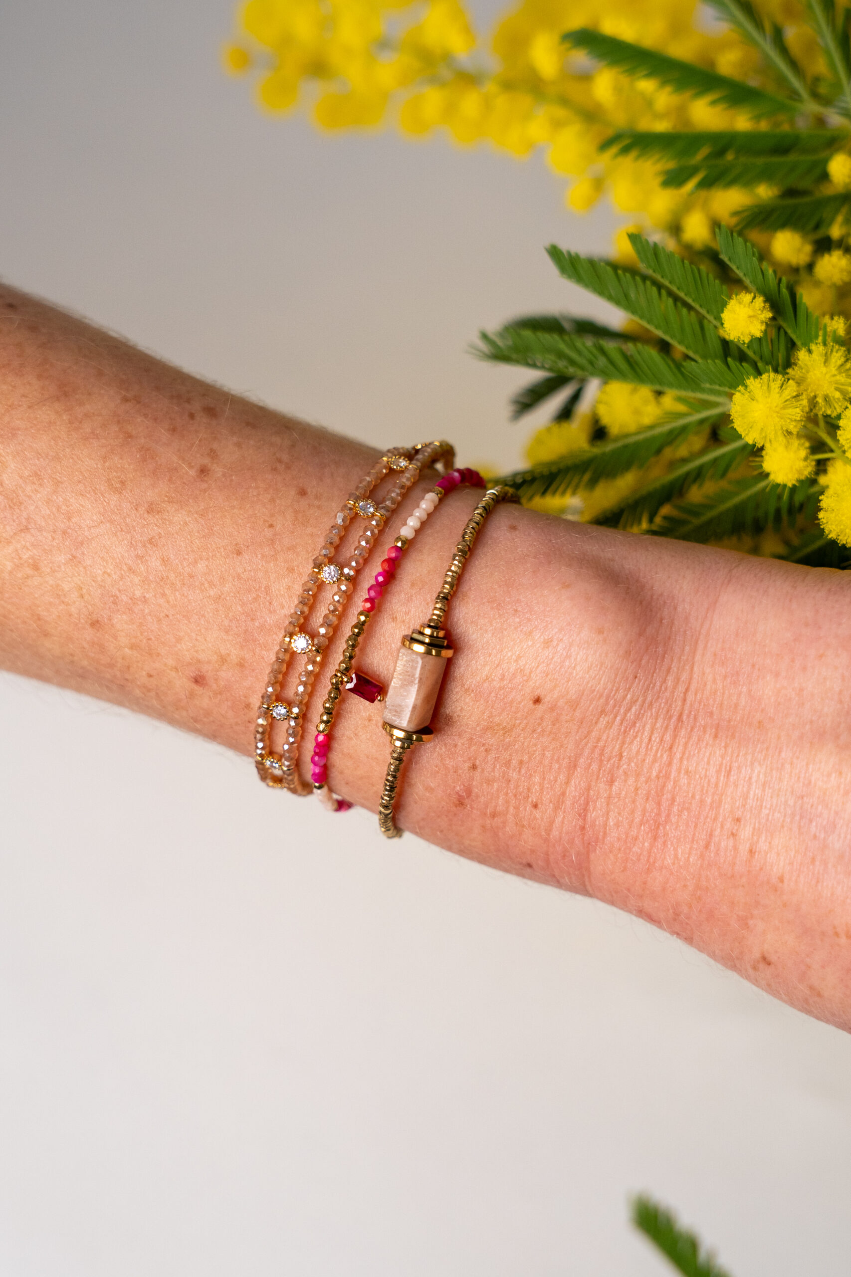 Explorez une palette de couleurs douce et singulière avec le bracelet California. Cette version envoûtante mêle la délicatesse des pierres mates à l’éclat mystérieux du verre. Assemblé à la main avec soin dans notre atelier marseillais, ce bijou apporte une touche de sophistication bohème à votre poignet.